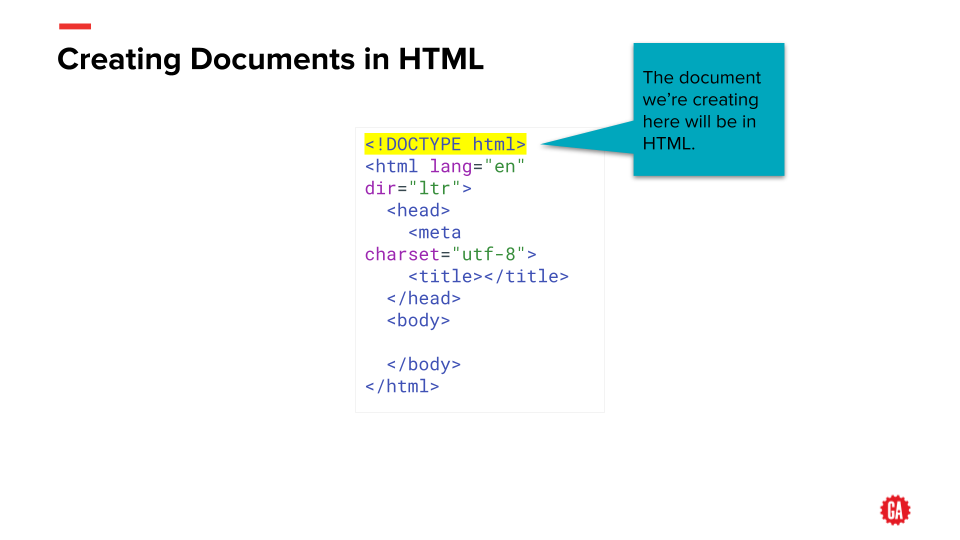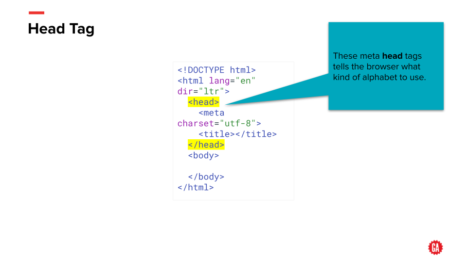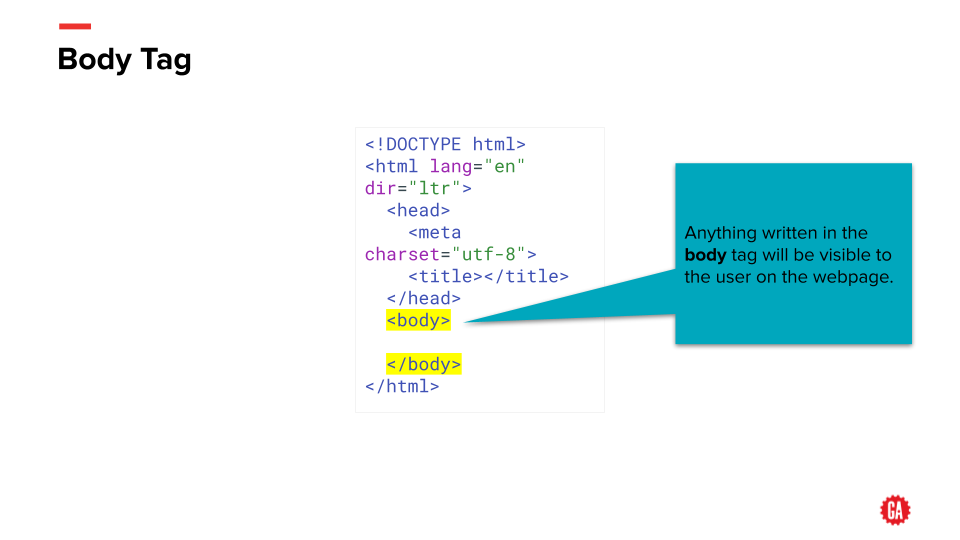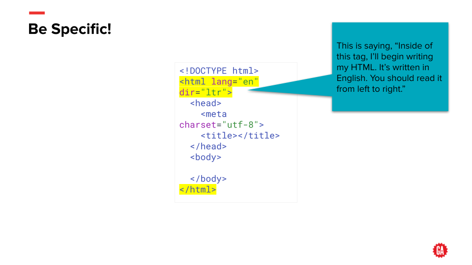 HTML is composed of logically named tags The tags can also have attributes applied to them, to further specify what’s inside of them. Some tags are self-closing*, meaning they don’t have an ending tag.
